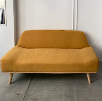 マスタードイエローのソファです。2人がけ、もしくはお子様との3人がけにぴったりです。